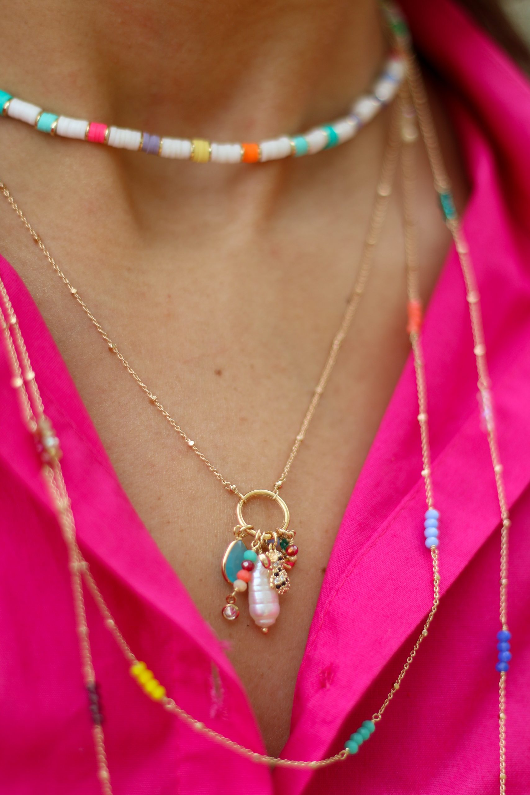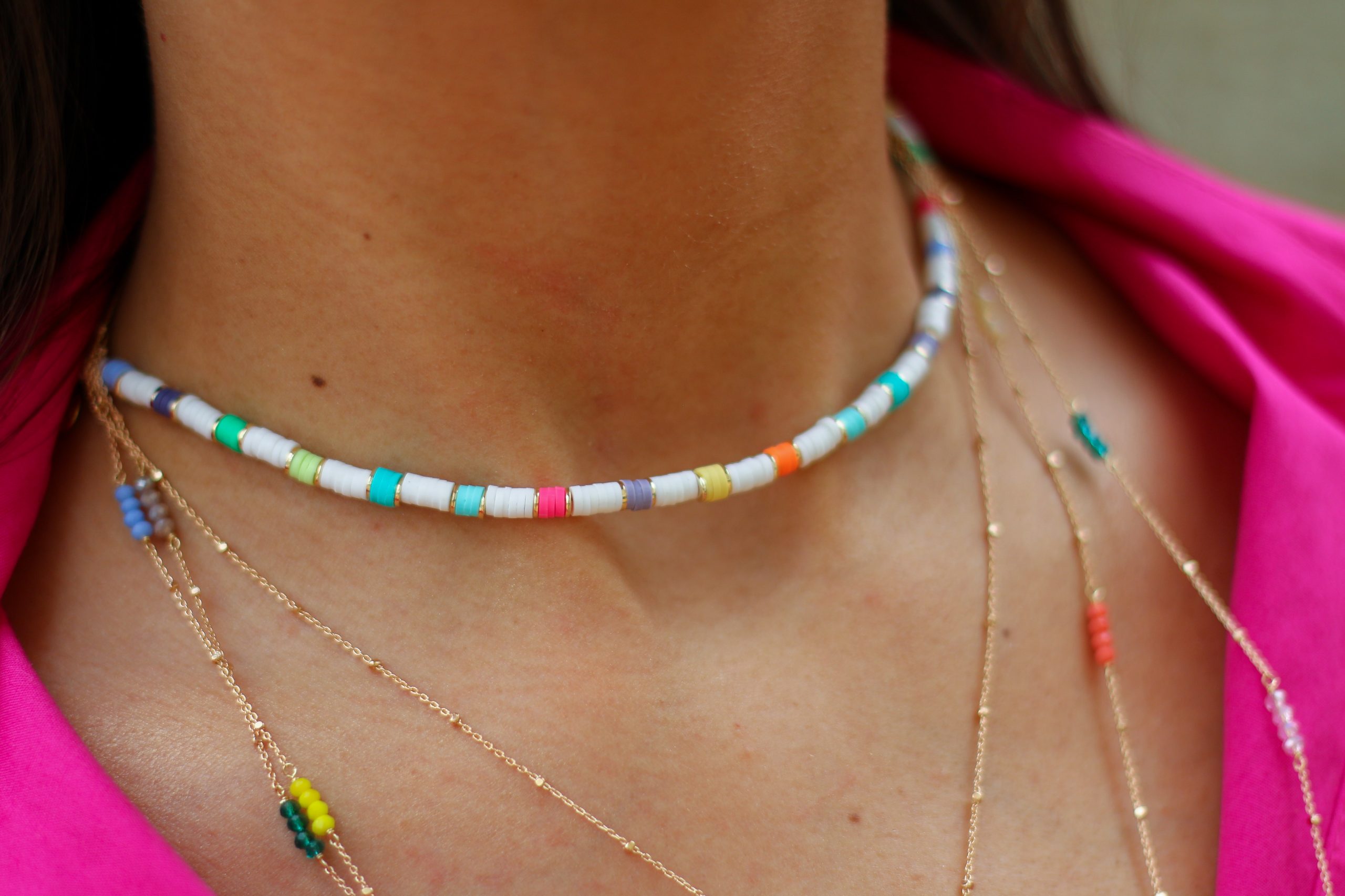 01 – Colar banhado a ouro com borrachinhas coloridas e detalhes dourados. Tamanho: 36cm