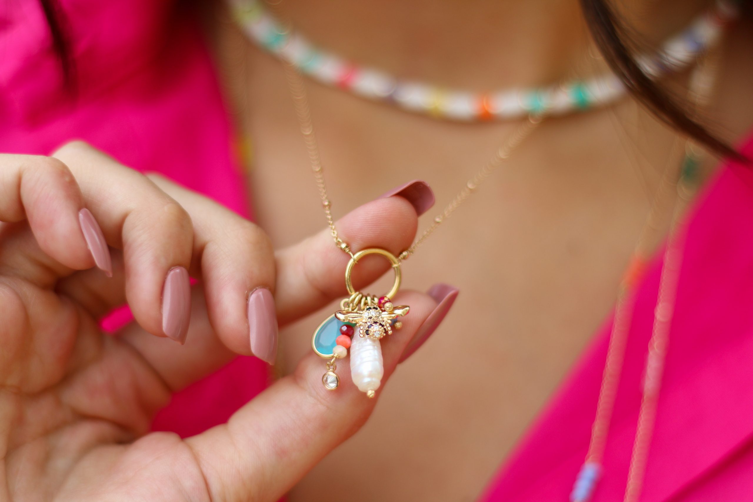 02 – Colar banhado a ouro com pingentes variados de pedras e uma abelha cravejada de zircônias negras. Tamanho: 45cm