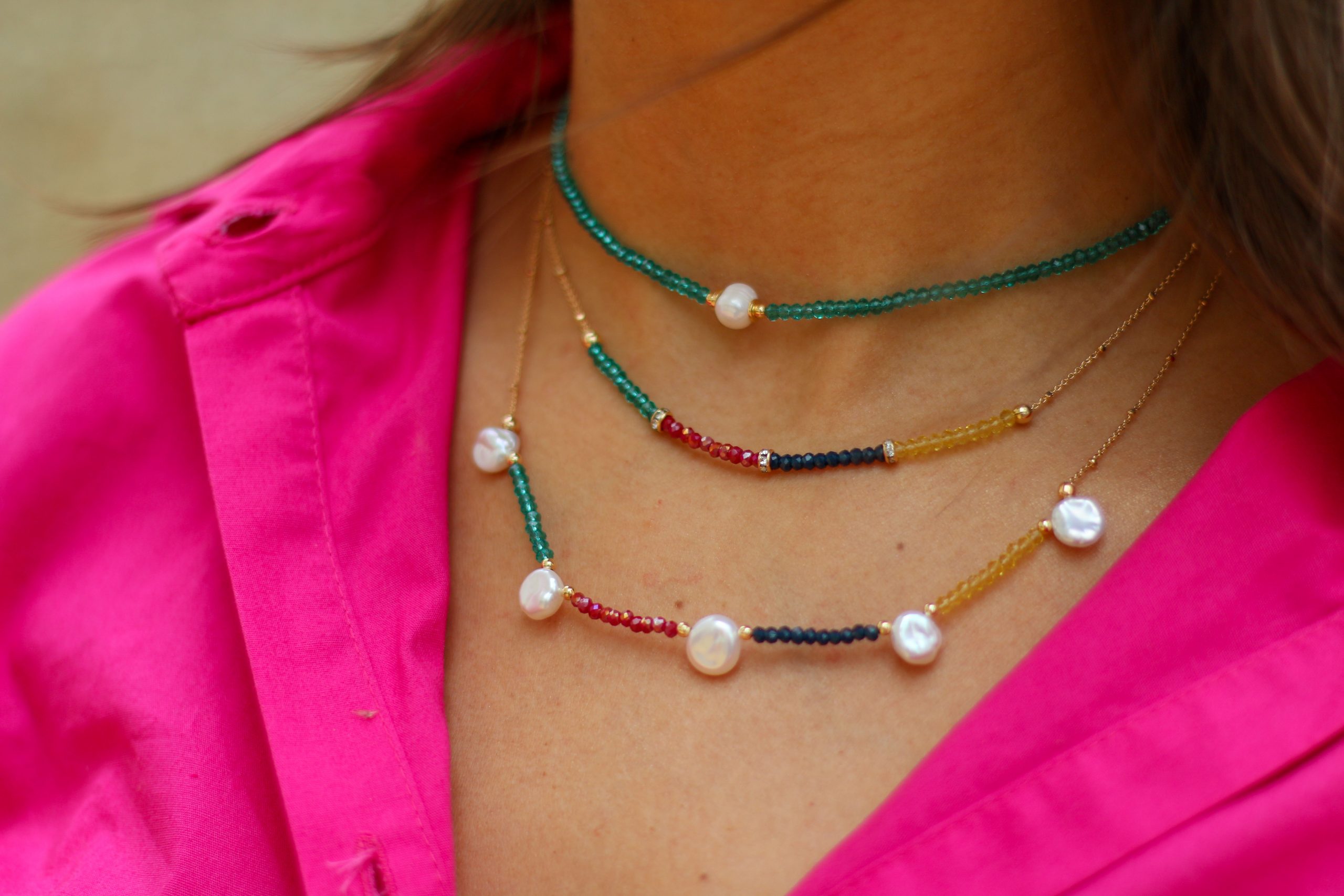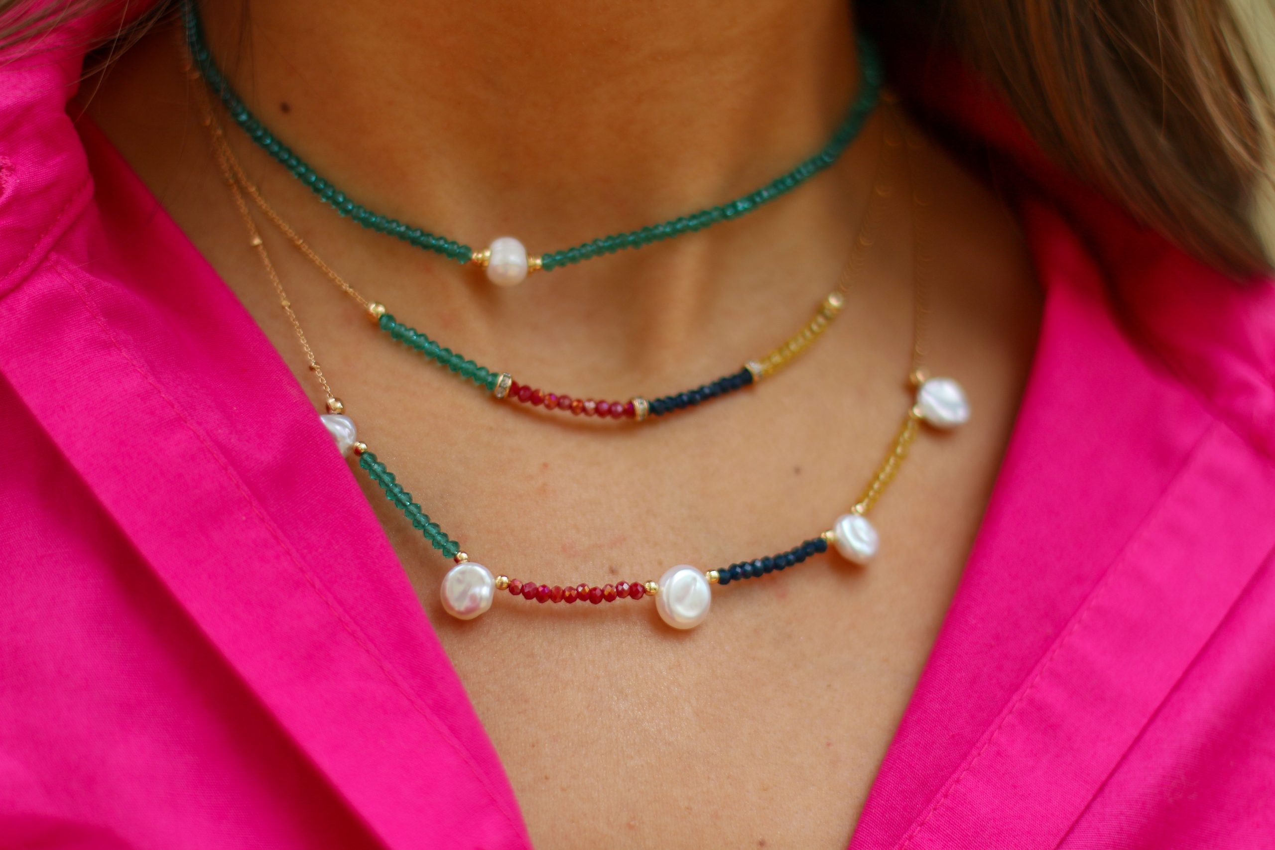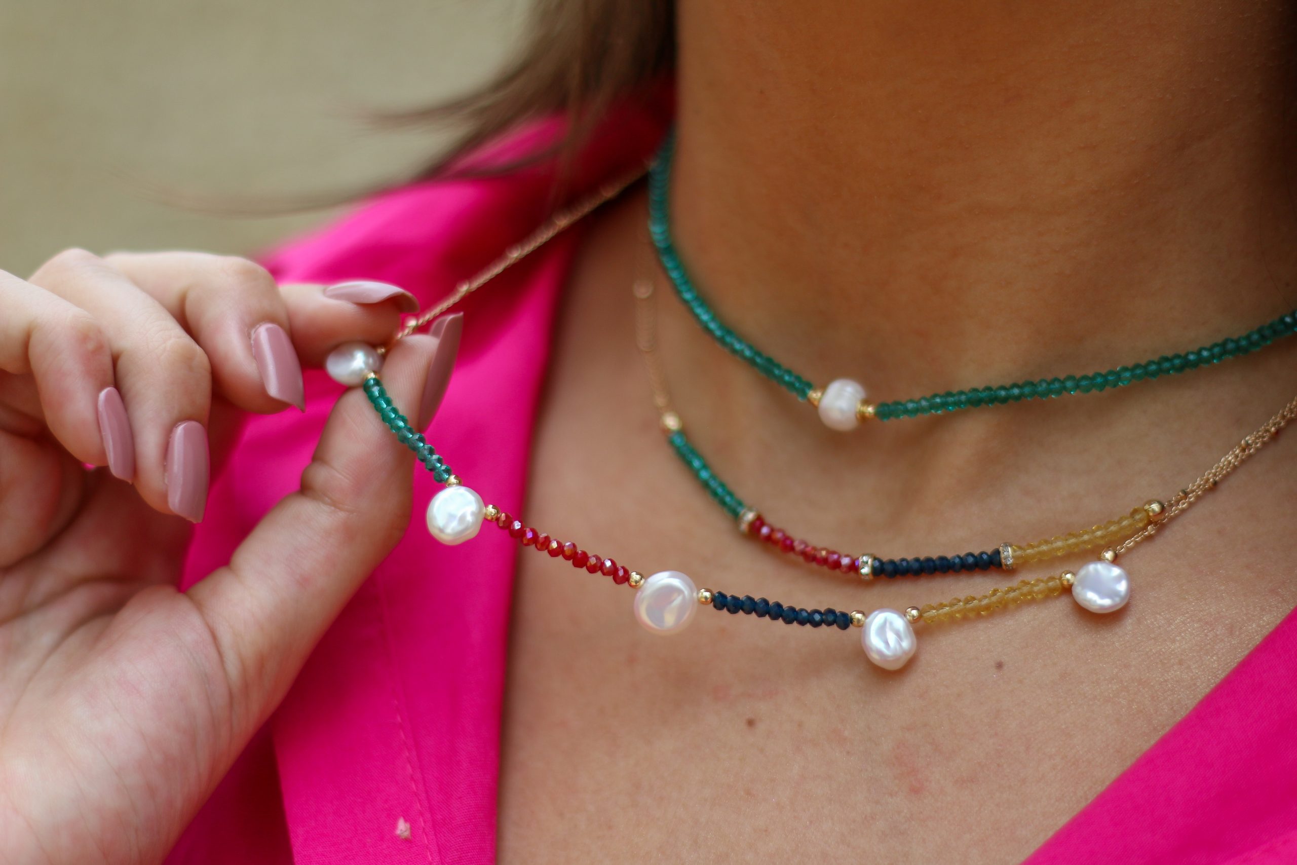 01 – Colar banhado a ouro  com cristais verdes e detalhe de pérola. Tamanho: 34cm (choker)