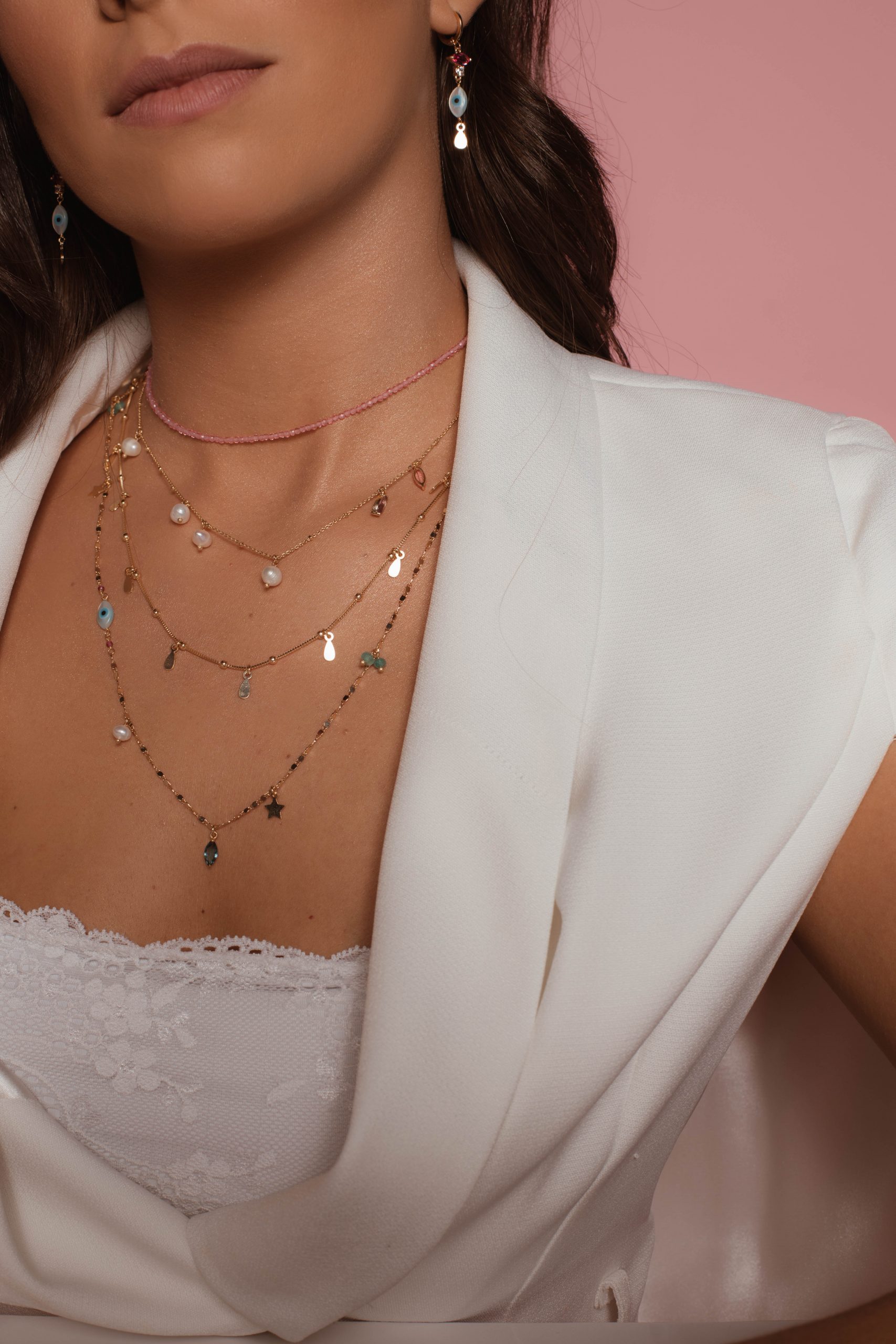 04 – Colar banhado a ouro com corrente delicada e detalhe de olho grego em madrepérola, pérola barroca, pingente estrela, navetes de cristal e pedras naturais. Tamanho: 64cm
