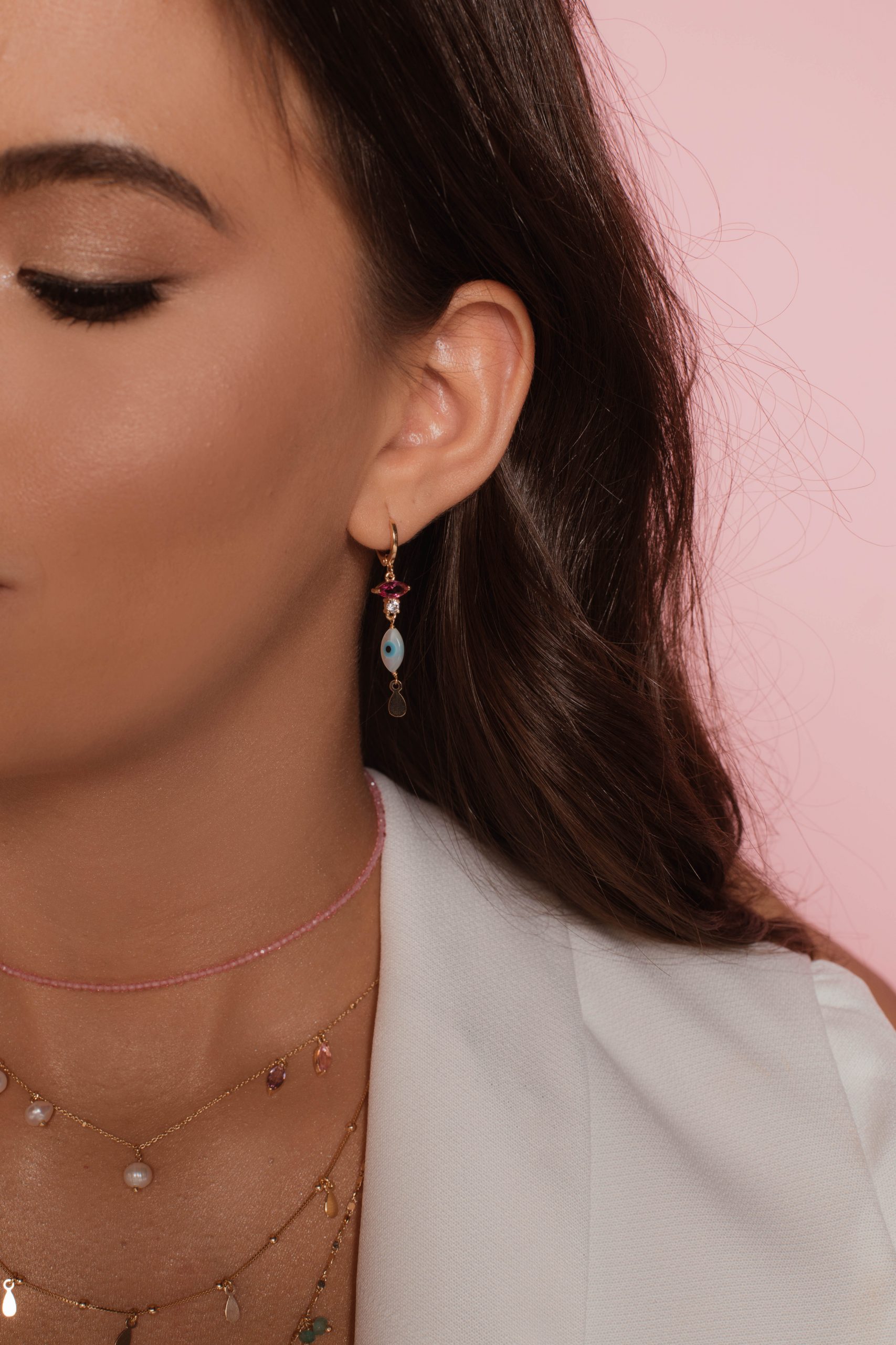 05 – Brinco banhado a ouro com navete cor de rosa, olho grego em madrepérola e drops dourados.