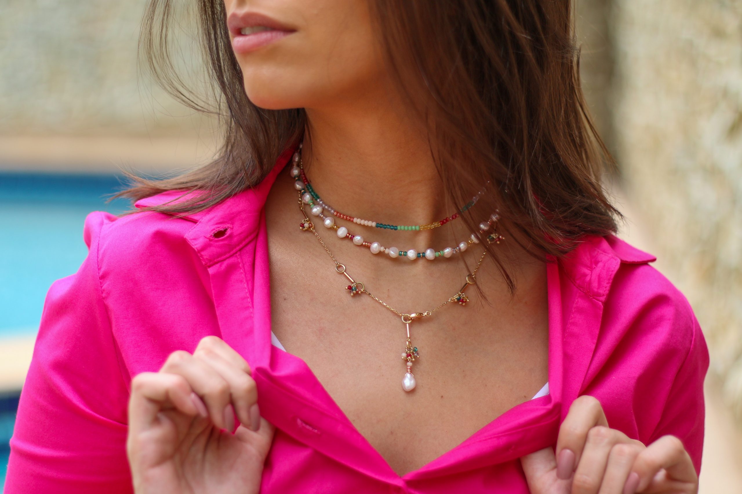 03 – Colar banhado a ouro com fecho frontal e detalhes de pérolas barrocas e cristais coloridos. Tamanho: 42cm (fecho frontal)