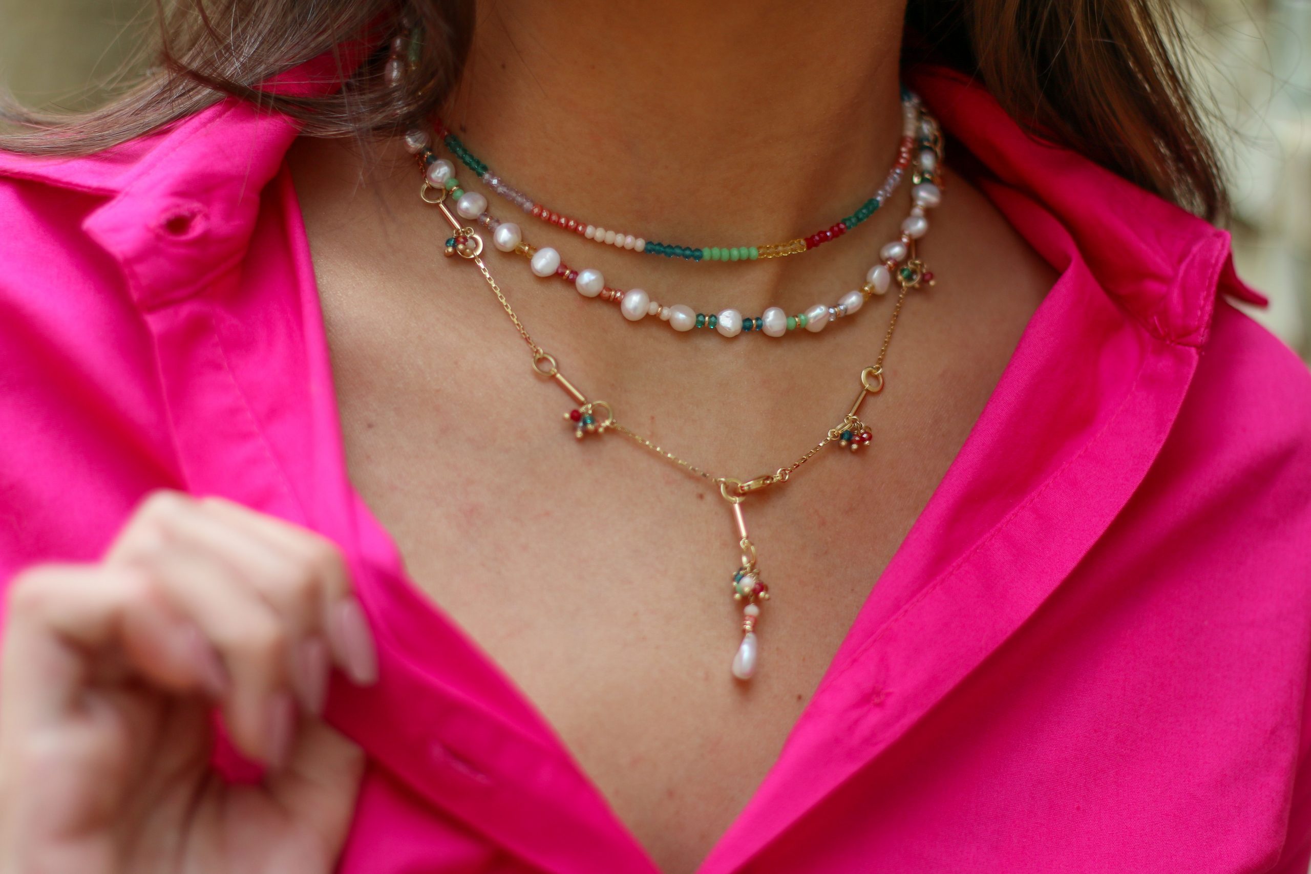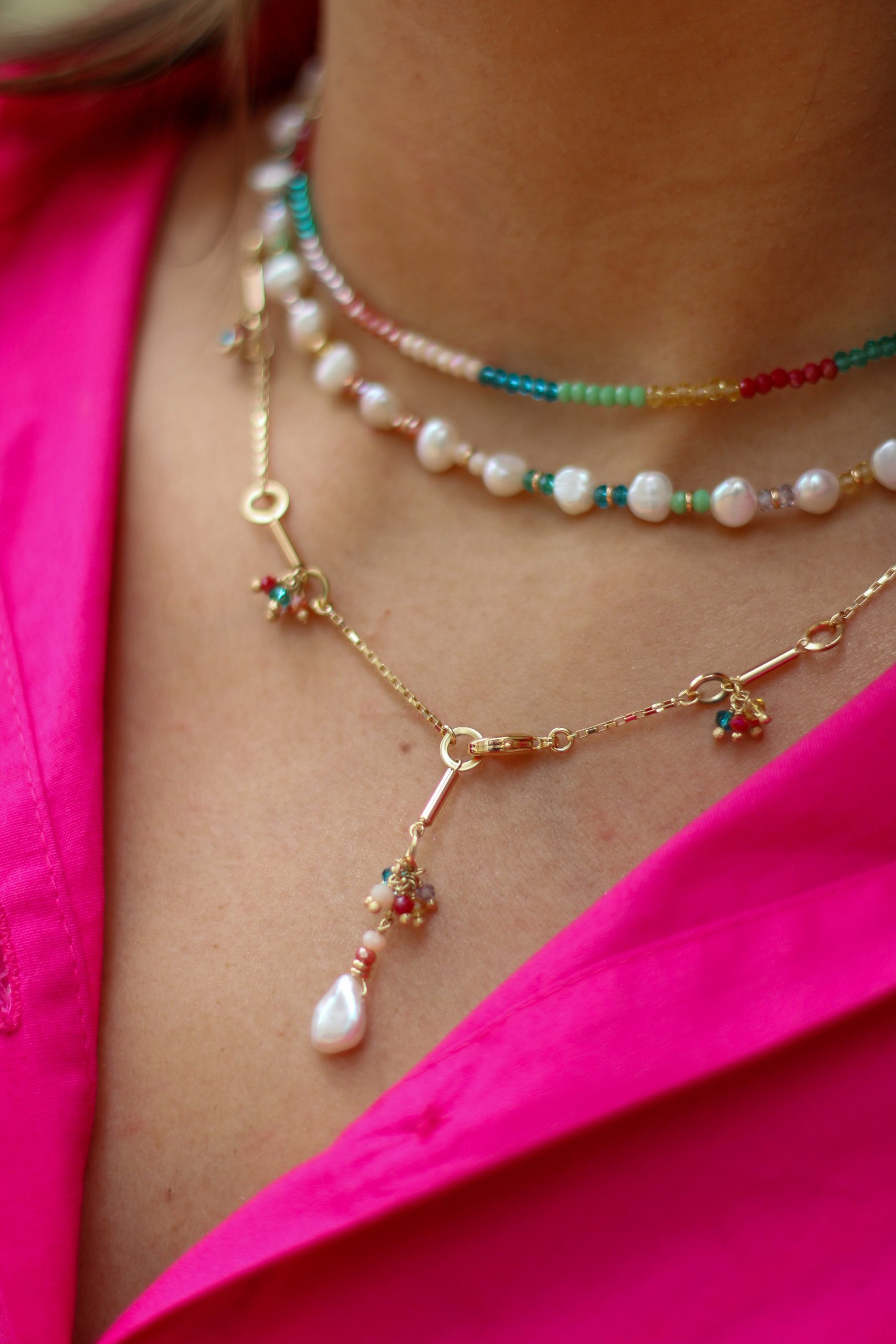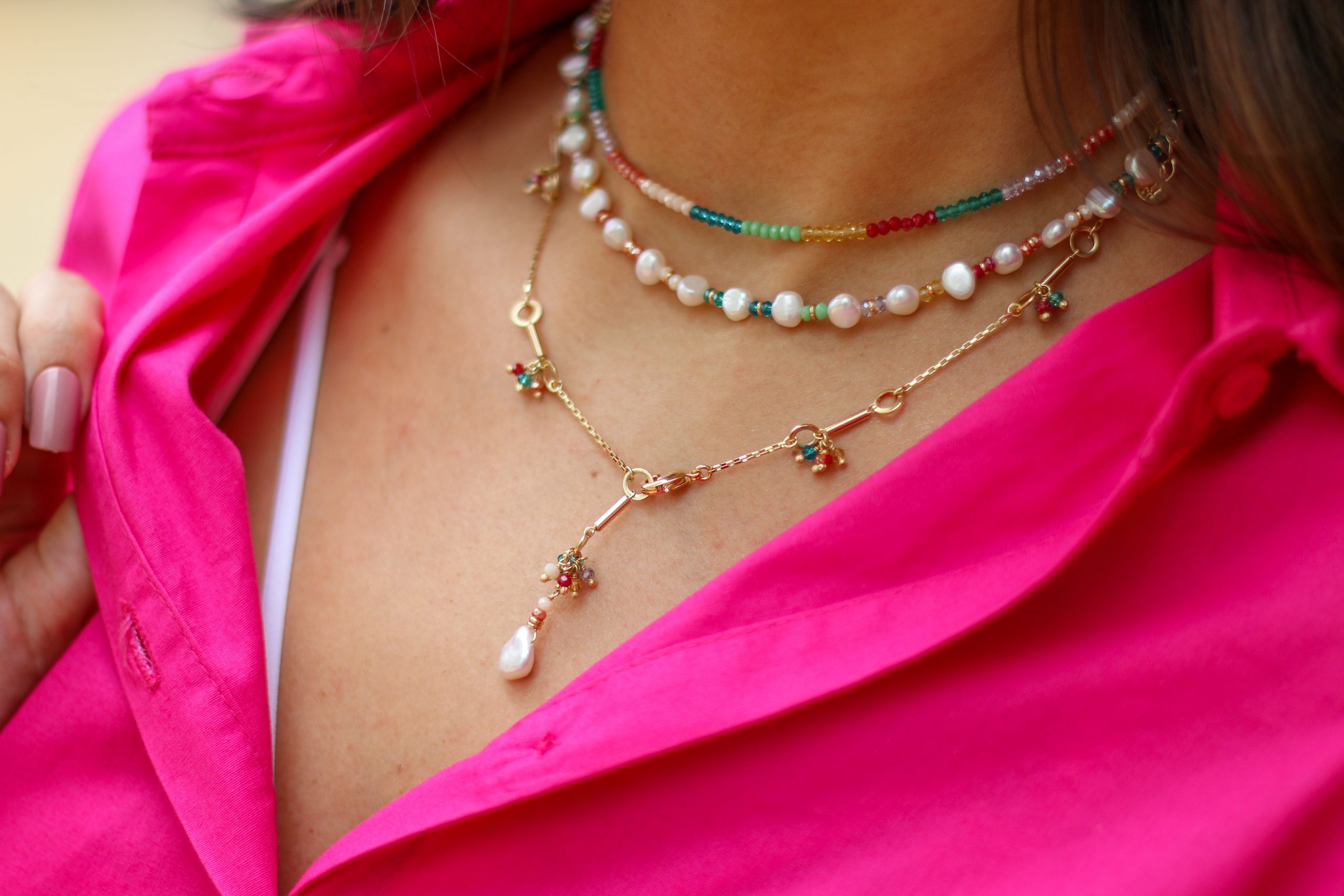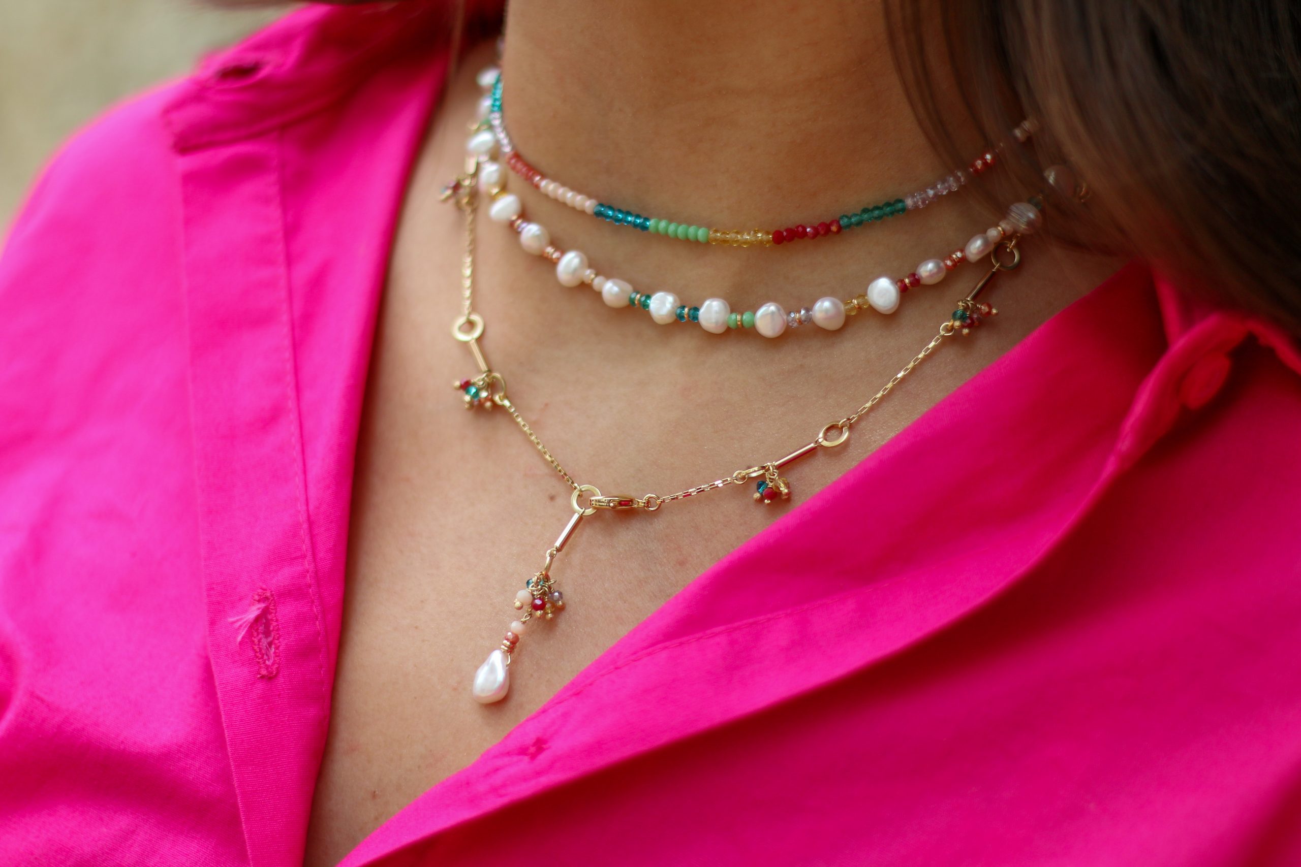 02 – Colar banhado a ouro com detalhes de pérolas barrocas e cristais coloridos. Tamanho: 38cm