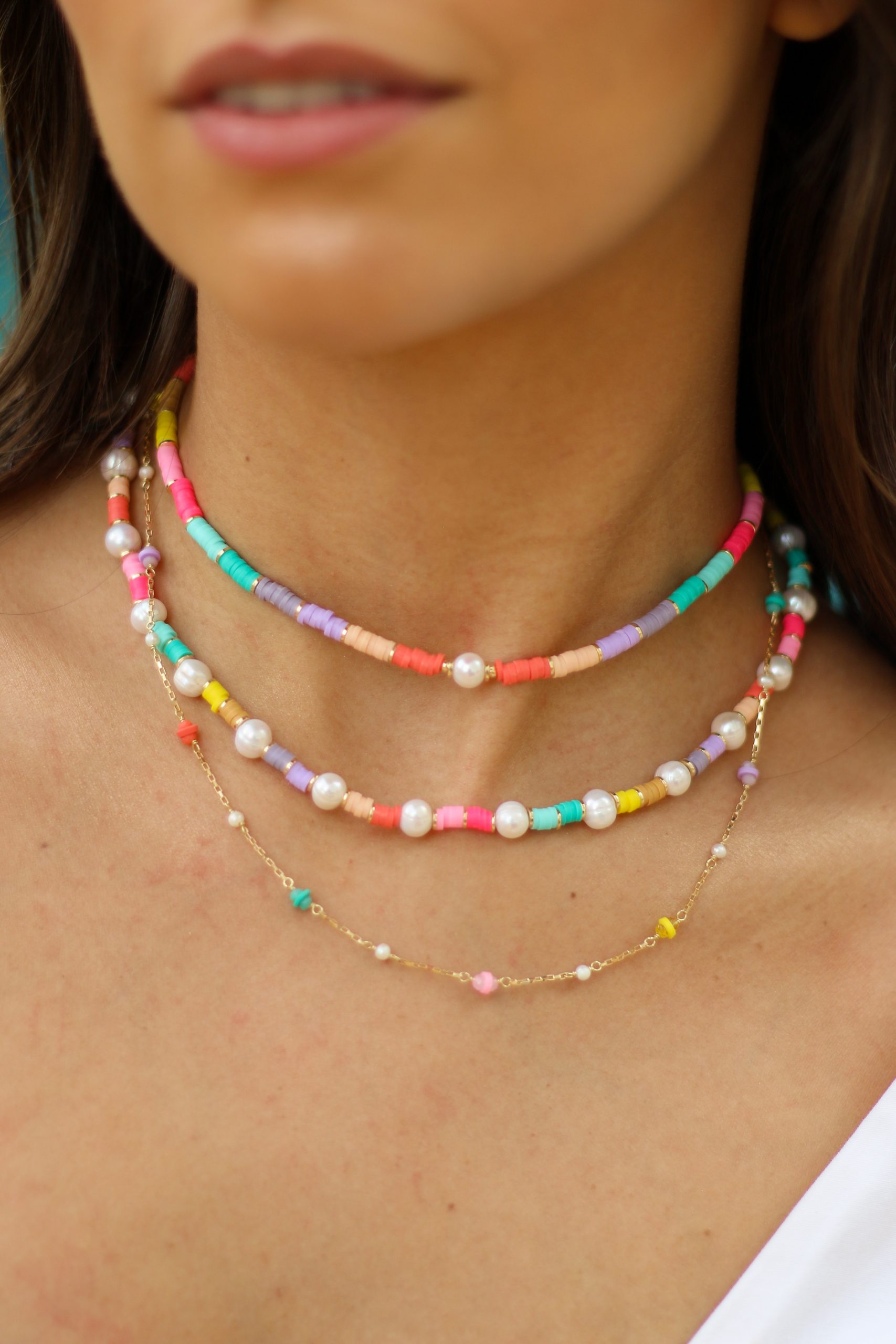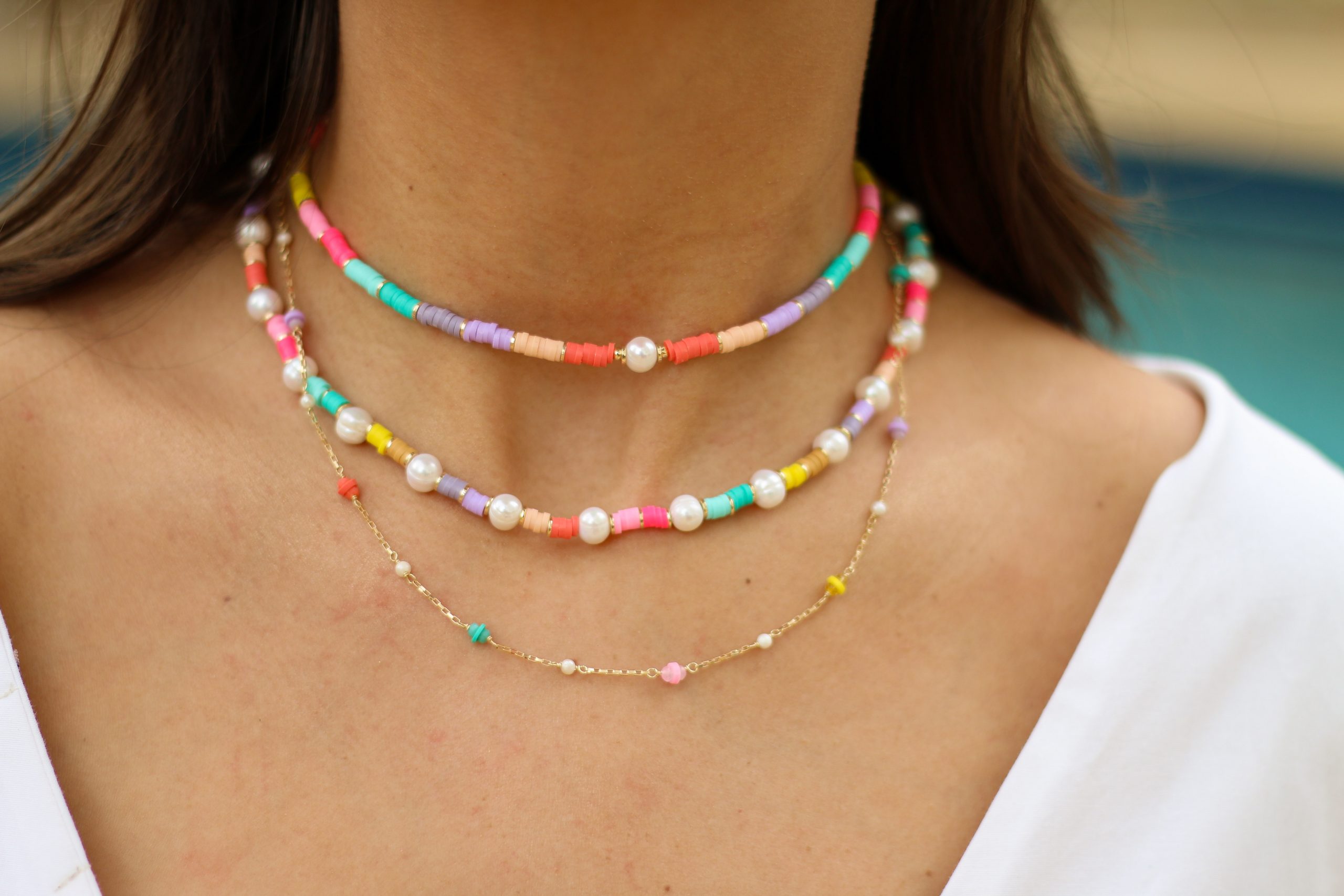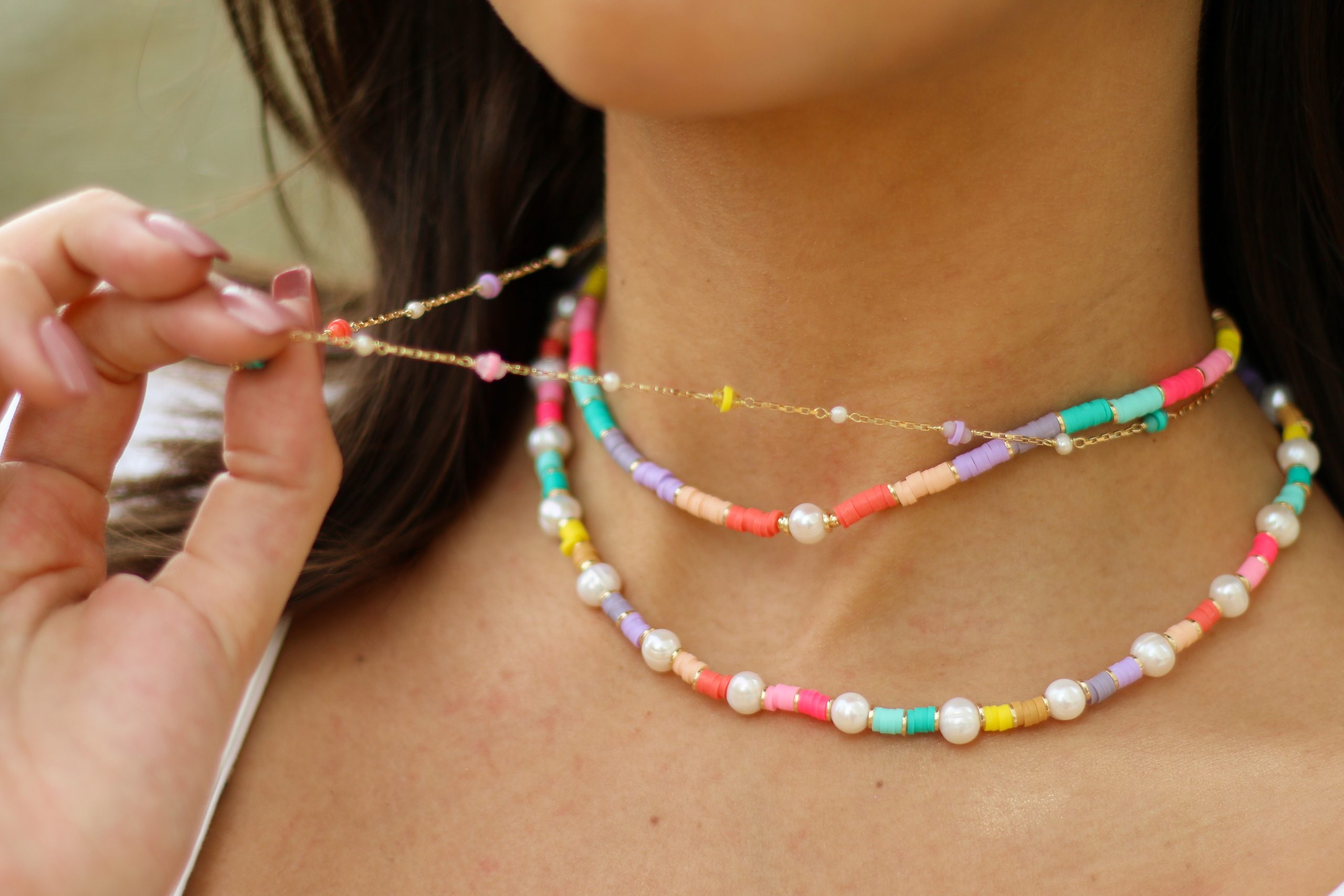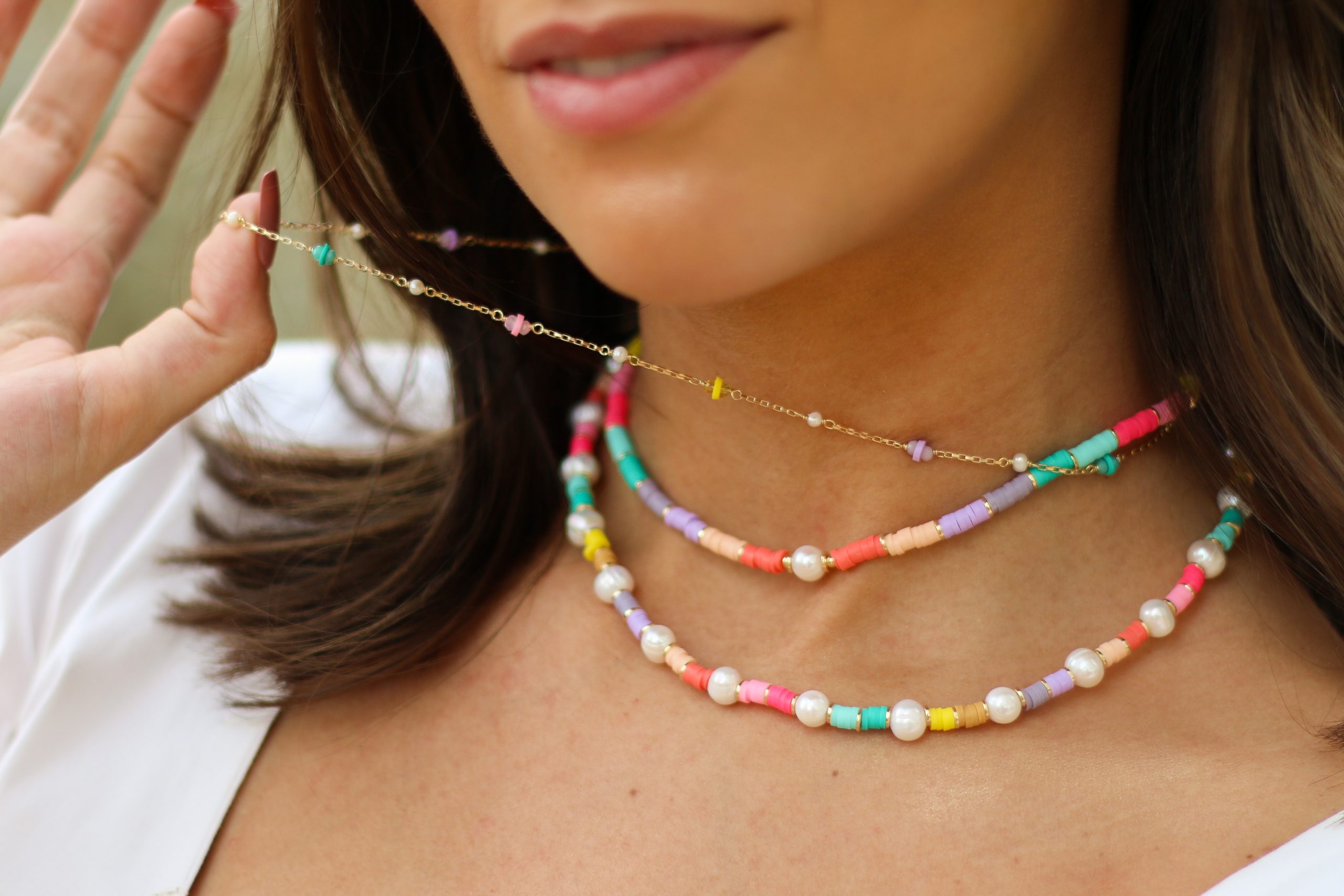 01 – Colar banhado a ouro com borrachinhas coloridas e detalhe em pérola barroca. Tamanho: 34cm