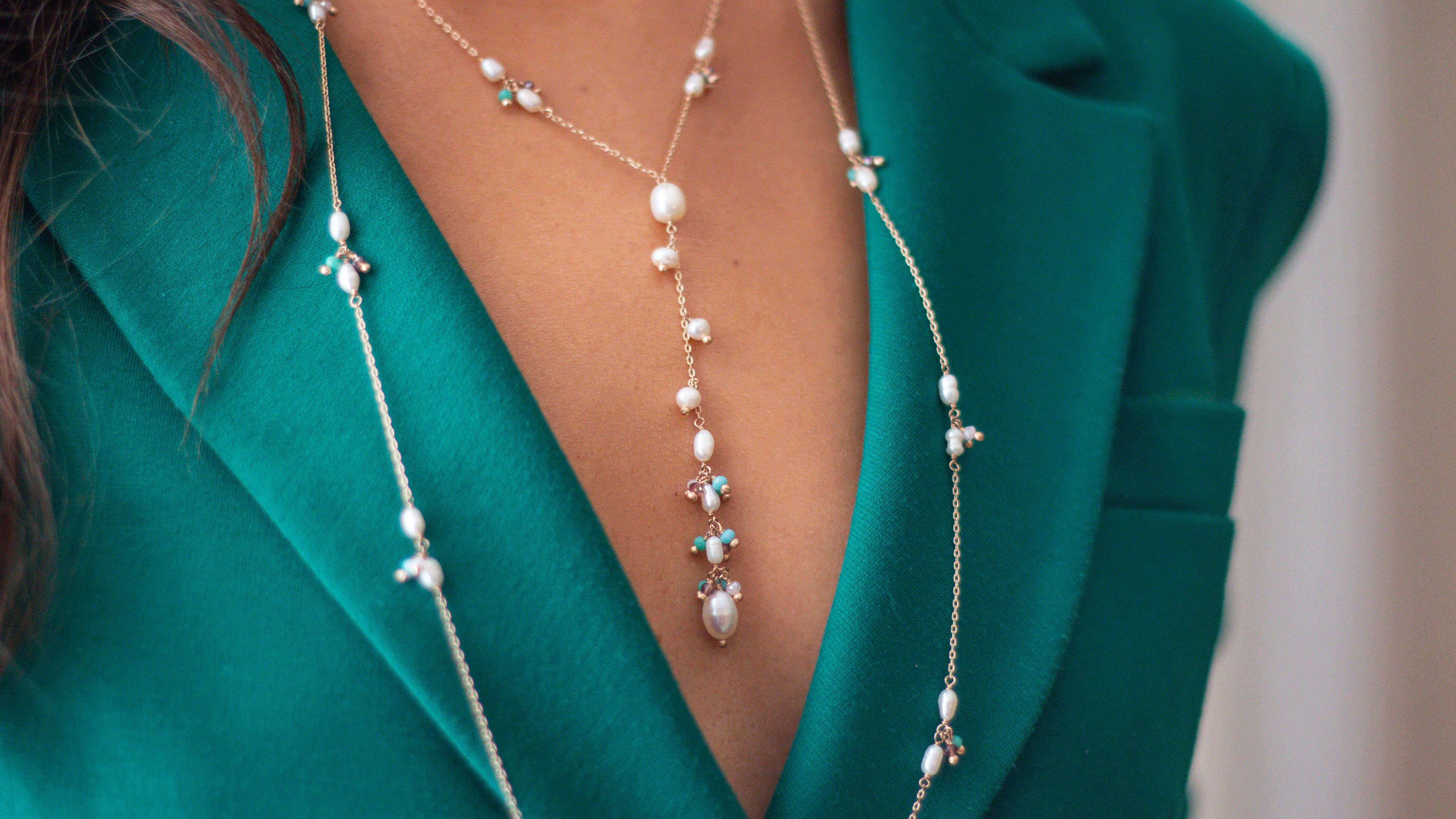 03 – Colar banhado a ouro com detalhes de pérolas barrocas e cristais coloridos. Tamanho: 80cm